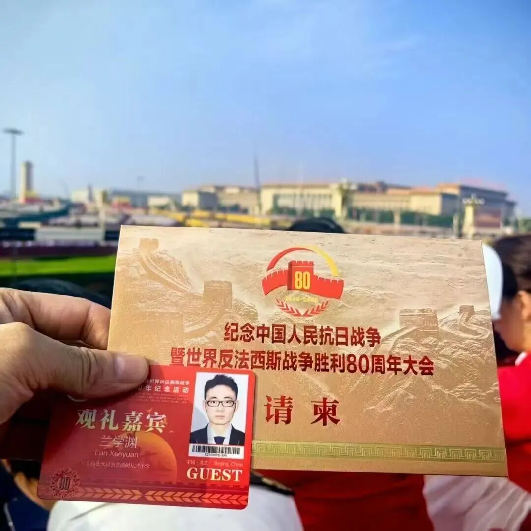 9月3日,纪念中国人民抗日战争暨世界反法西斯战争胜利80周年盛大阅兵在北京隆重举行。河北省航空航天学会常务理事、张家口市科技创新教育学会副会长、全国模范教师兰学渊,受邀出席观礼,与全国人民共同见证这一历史荣光!