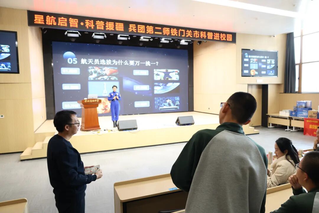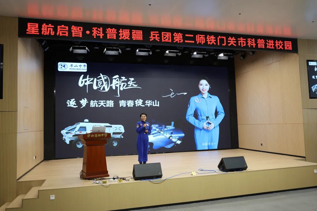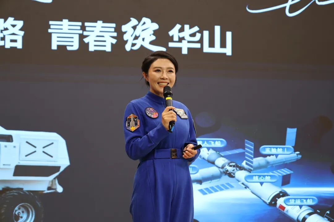活动现场,特邀中国航天女教官、载人航天工程专家王一以《逐梦航天路青春绽华山》为题,为学生们带来了一场生动精彩的科普讲座。作为参与七次载人航天任务的资深航天人,她以航天员教员、模拟航天员的双重身份,讲述了航天员训练、火箭发射、空间站建设等背后的故事,引得现场掌声不断。