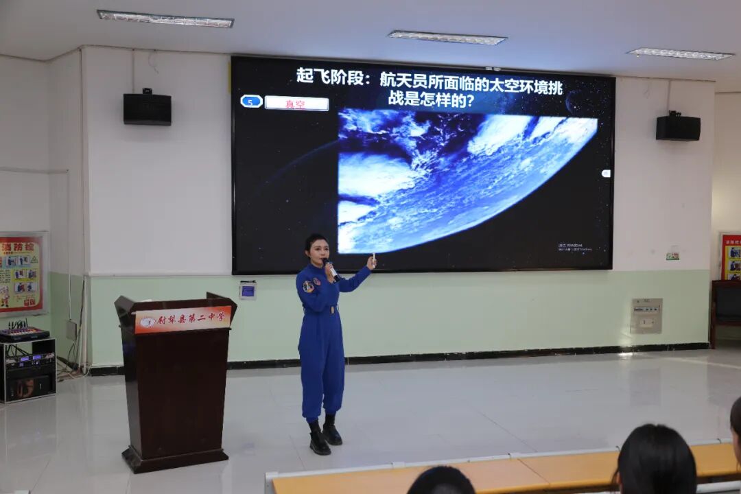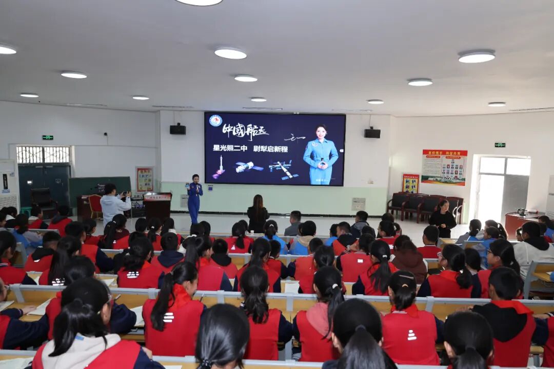 活动现场,中国载人航天工程专家王一为学生们带来了《星光照二中 尉犁启新程》专题讲座。作为历任多批次航天员教员、承担七次载人航天任务的专家,王老师用通俗易懂的语言,带领同学们开启了一段精彩的航天科普之旅。她从空间站日常生活到航天员选拔训练,从神舟系列任务的热点话题到未来航天发展展望,用生动有趣的讲述引发同学们的阵阵掌声和热烈讨论,在轻松愉快的氛围中播撒航天梦想的种子。