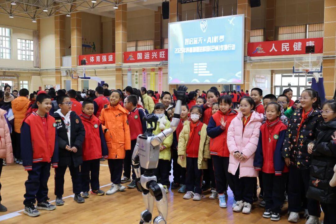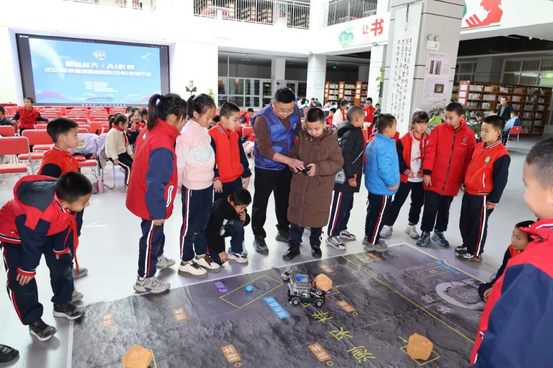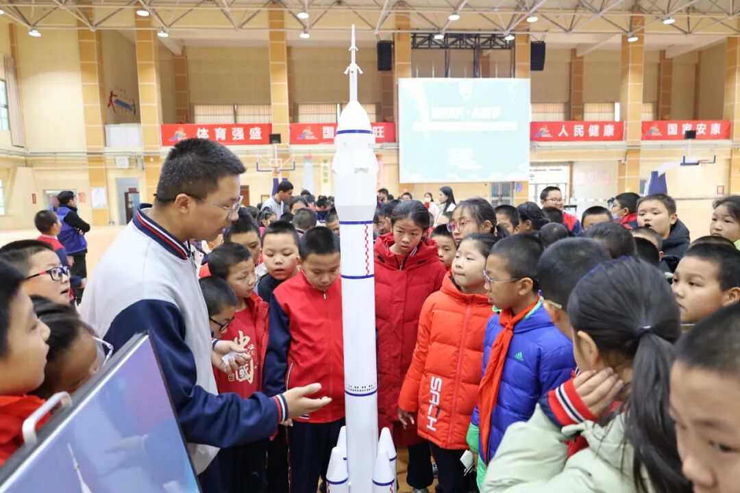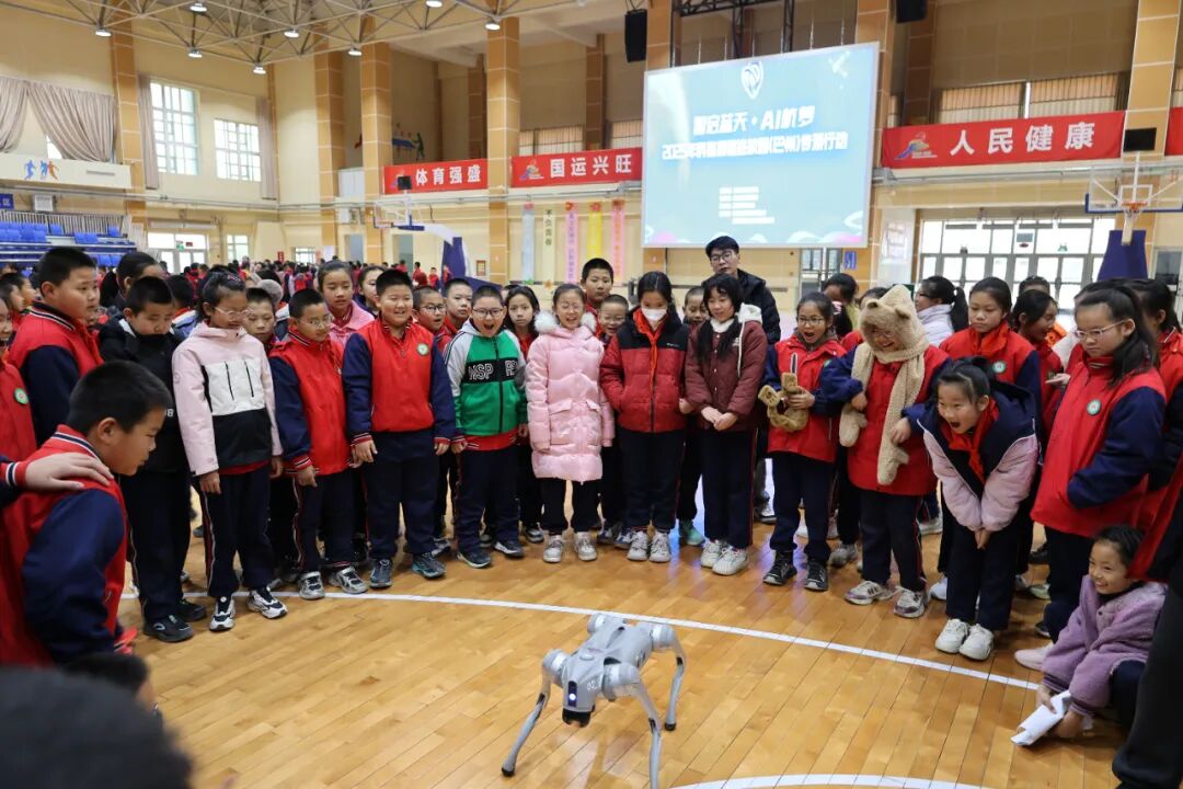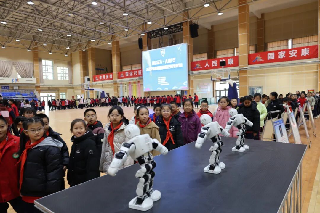 展览区,智能机器人展示成为亮点。机器狗精准完成各项指令动作,展现出卓越的运动性能;人形机器人则与学生们展开亲切互动,完成握手、拥抱等多样化展示。这些智能设备与航空航天模型相得益彰,为学生们打造了一个沉浸式的科技体验空间。