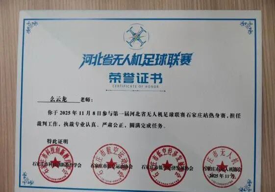 ——贺炳达、么云龙、崔佐静、徐鹏程4位老师担任河北省无人机足球联赛石家庄热身赛裁判工作。