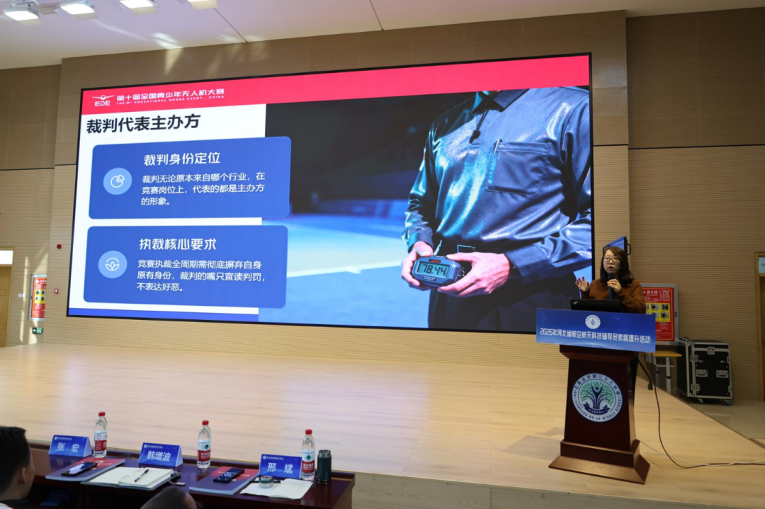 河北省航空航天学会副秘书长刘凯平,围绕第十届全国青少年无人机大赛进行整体介绍与赛项规则全面解读,清晰说明赛事安排、省赛筹备与参赛要点;随后开展《匠心执裁,护航蓝天》专题分享,明确裁判职责、执裁标准与工作要求,强化赛事公平公正理念。